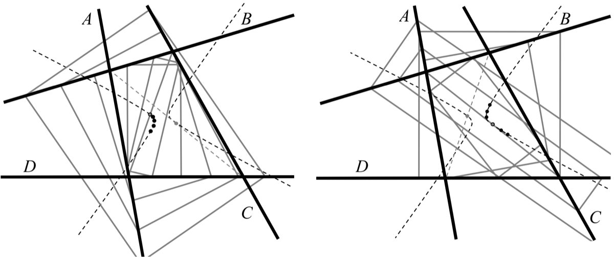 FIGURE 2. This configuration is degenerate because its diagonals are orthogonal (Theorem 7.1). The darker dotted line through each figure is a set of centers of inscribed rectangles. In the first figure, slope remains constant while aspect ratio changes, and in the second aspect ratio remains constant while slope changes. This phenomenon only happens in the degenerate case; compare to Figure 1. The centers of the rectangles in the first figure lie on the Gauss-Newton line through the midpoints of the diagonals, and in the second the centers lie on a line that is parallel to the diagonal through the intersection of A and C and that of B and D Theorem 9.1).